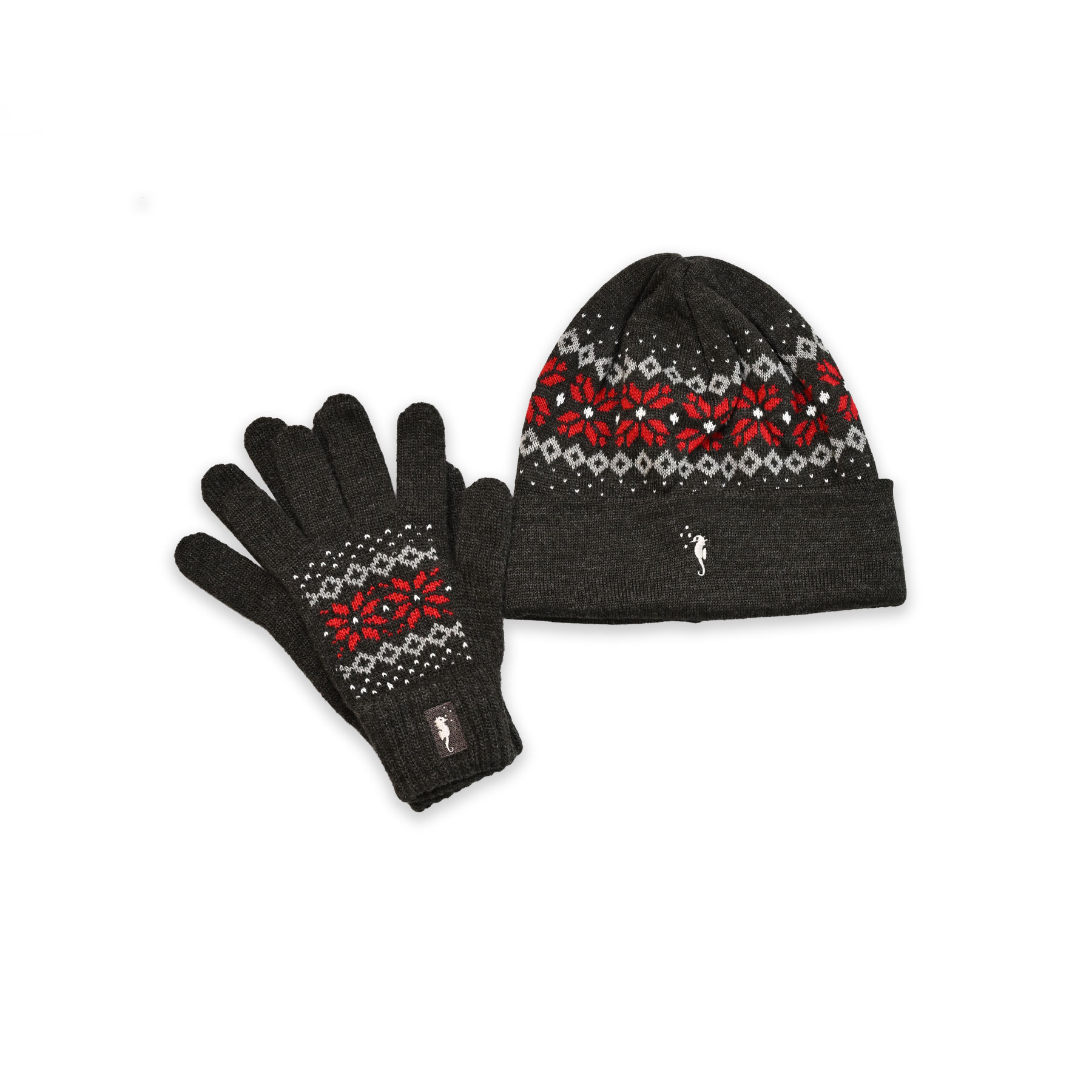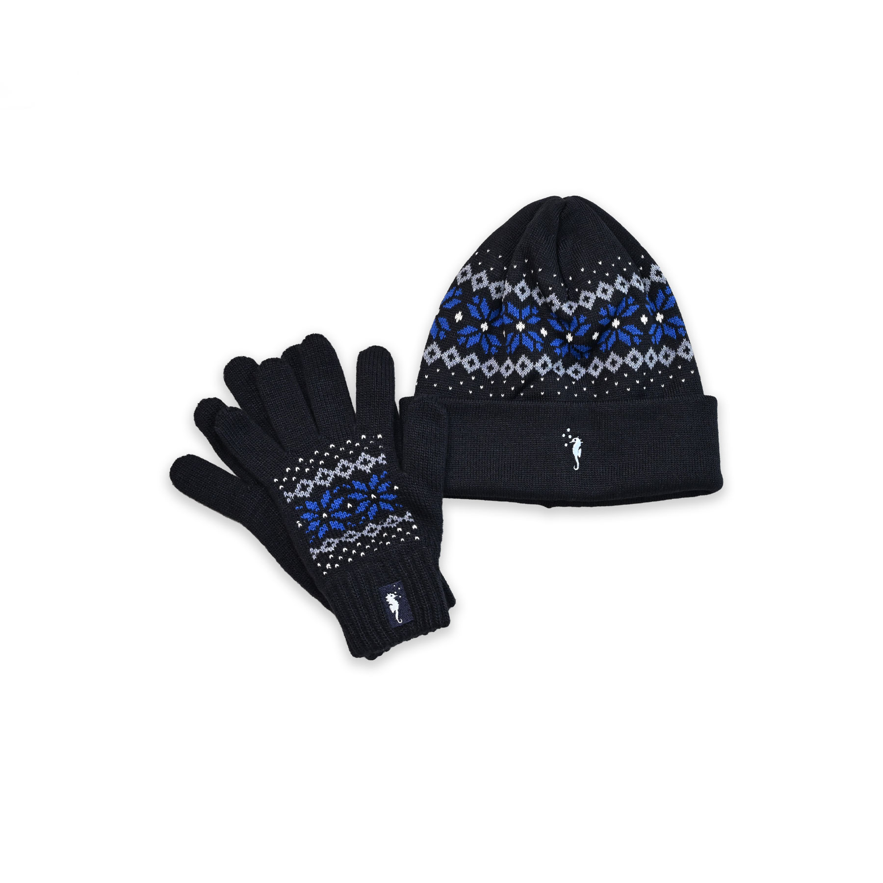 雪柄デザインのニット帽と手袋の2点セットです。コーディネートが冬らしく華やぎます。