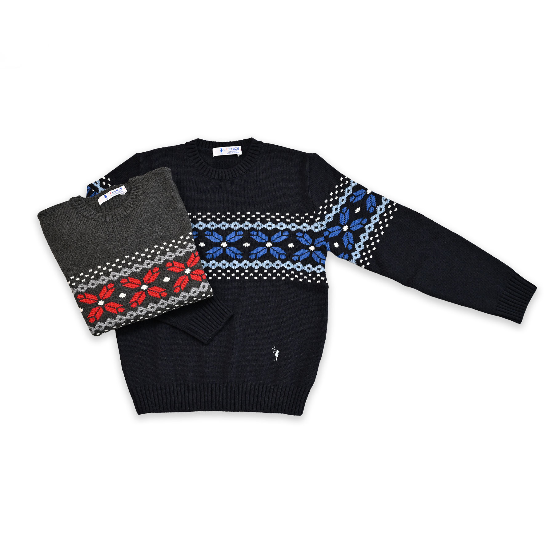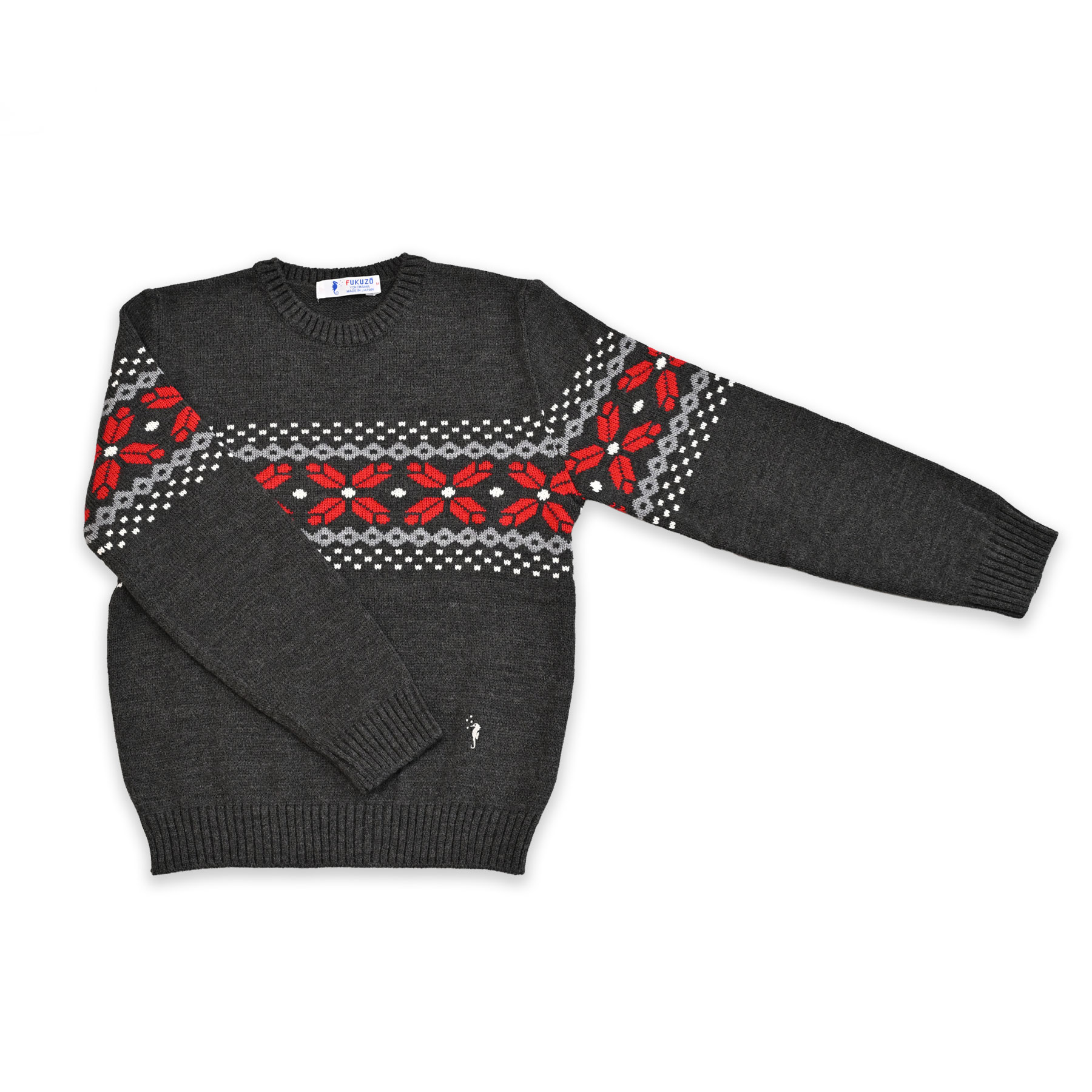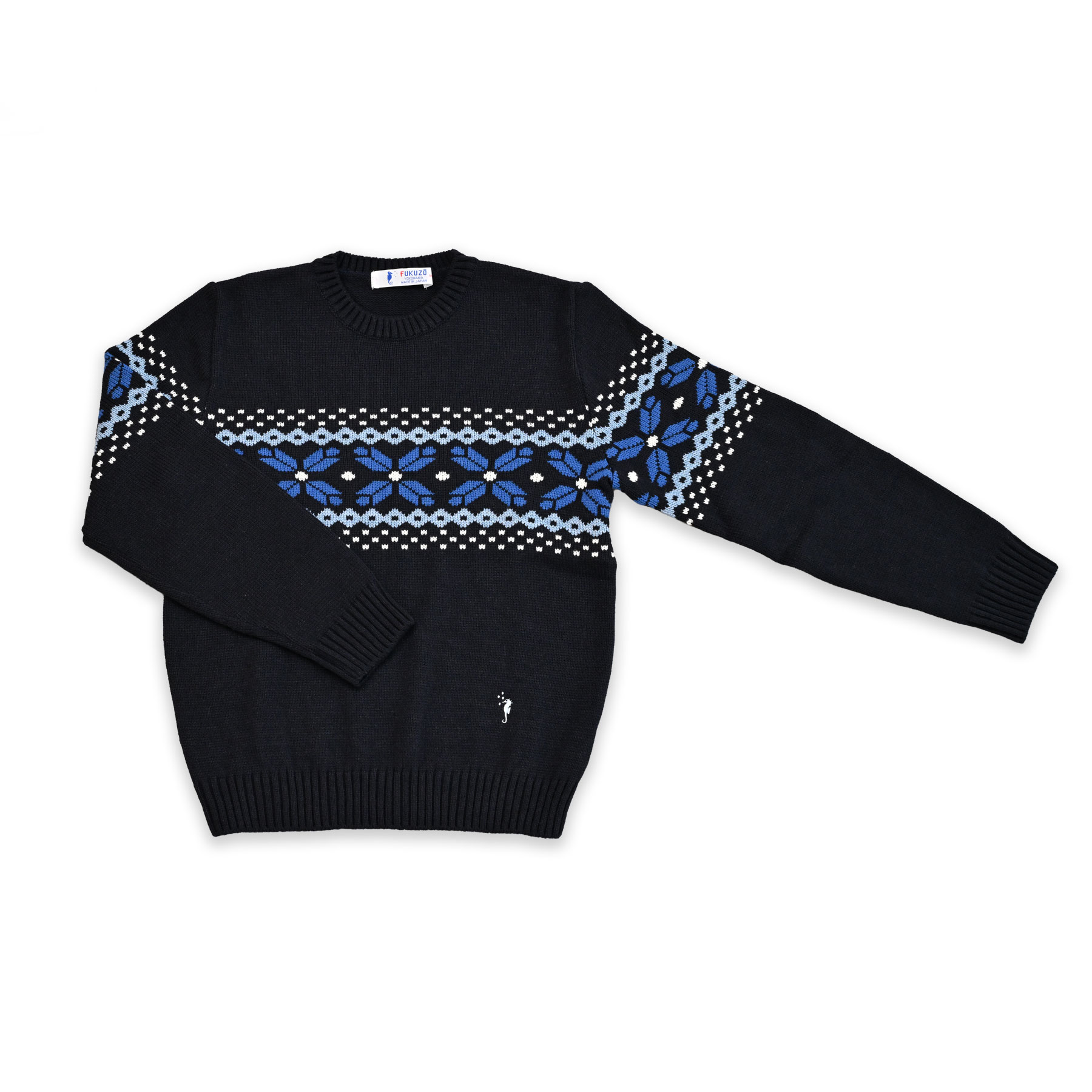 ほどよい厚みで暖かく、コーディネートの主役になる雪柄のクルーネックセーターです。タツノオトシゴのワンポイント刺繍が、大人のかわいさをプラスしてくれます。